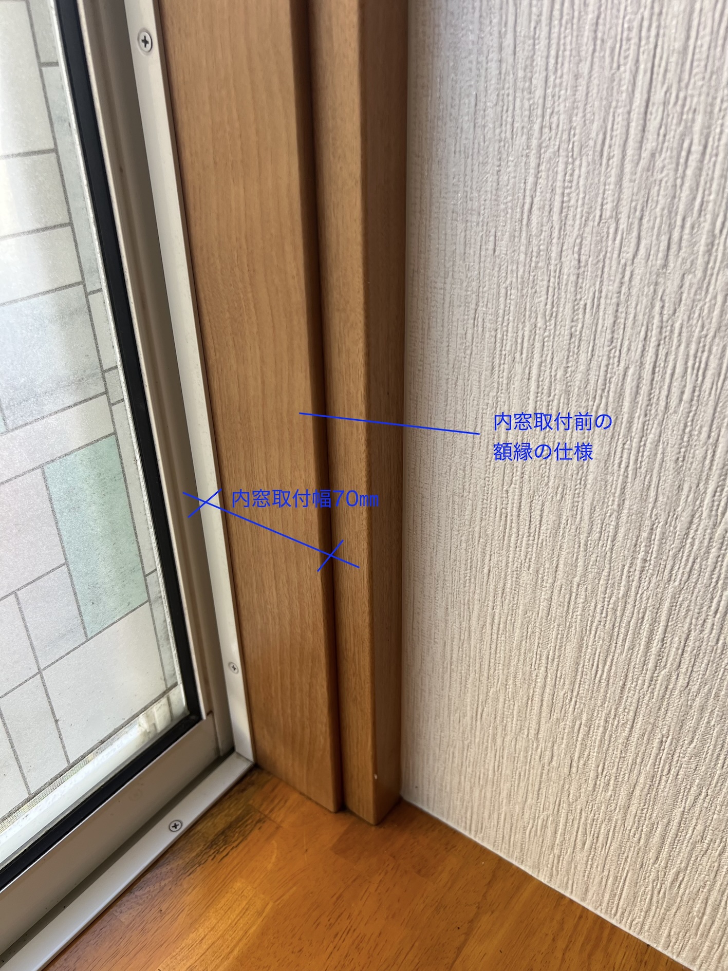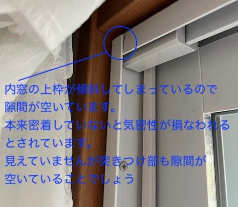 なんと額縁の幅が足らないまま何の処置もせず、内窓の枠がはみ出した状態で取り付けられていました。